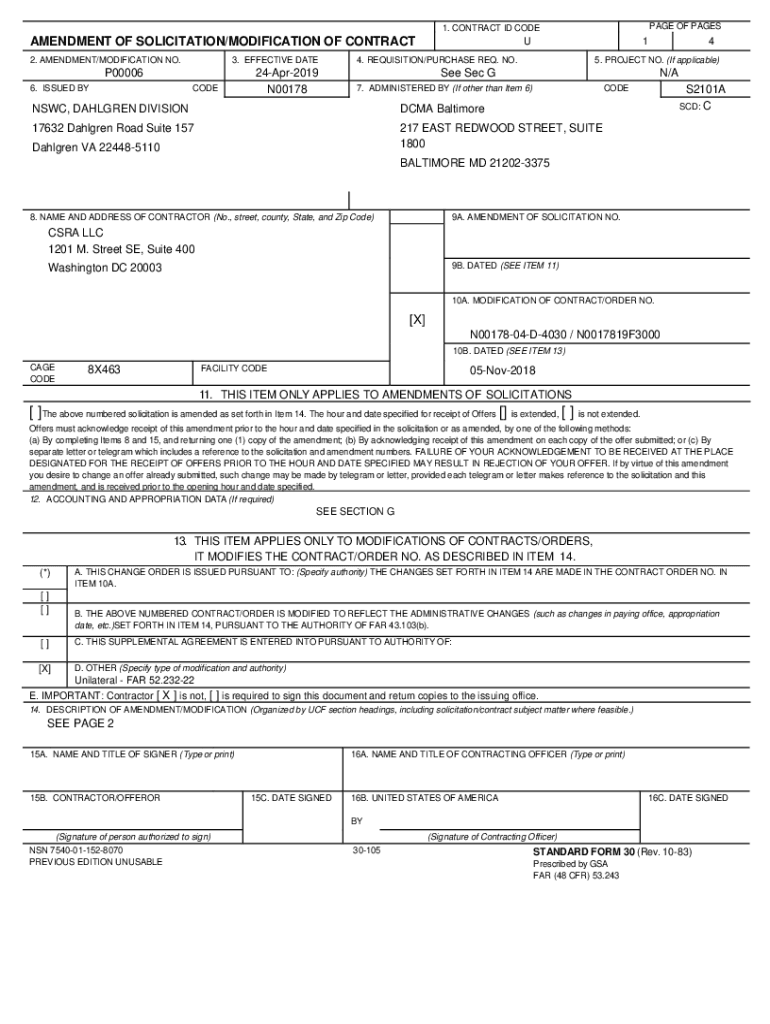 PAGE OF PAGES1. CONTRACT ID CODEPENDENT OF SOLICITATION/MODIFICATION OF CONTRACT 2. AMENDMENT/MODIFICATION NO.3. EFFECTIVE DATEP00006 6. ISSUED BYCODE24Apr2019 N001781U4. REQUISITION/PURCHASE REQ.