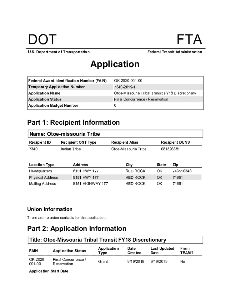 DOTTED. S. Department of Transportation Federal Transit AdministrationApplication Federal Award Identification Number (FAIN)OK202000100Temporary Application Number734020191Application NameOtoeMissouria
