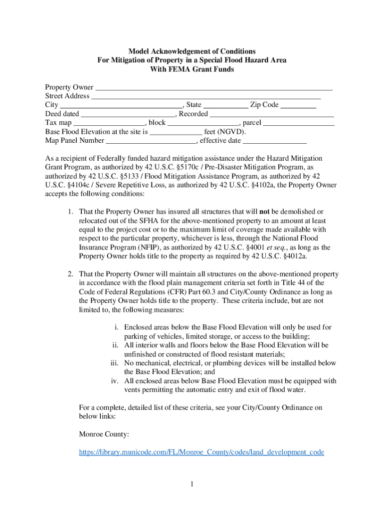 Model Acknowledgement of Conditions For Mitigation of Property in a Special Flood Hazard Area With FEMA Grant Funds Property Owner ___ Street Address ___ City, State Zip Code Deed dated ___, Recorded