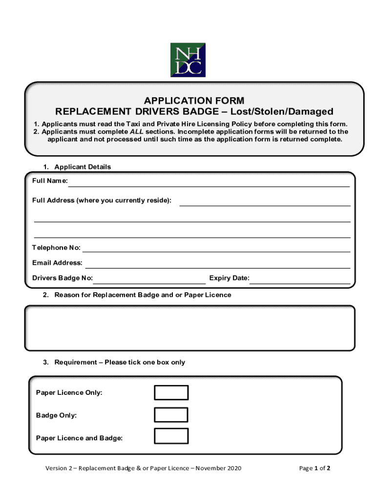 APPLICATION FORM REPLACEMENT DRIVERS BADGE Lost/Stolen/Damaged 1. Applicants must read the Taxi and Private Hire Licensing Policy before completing this form. 2. Applicants must complete ALL sections.