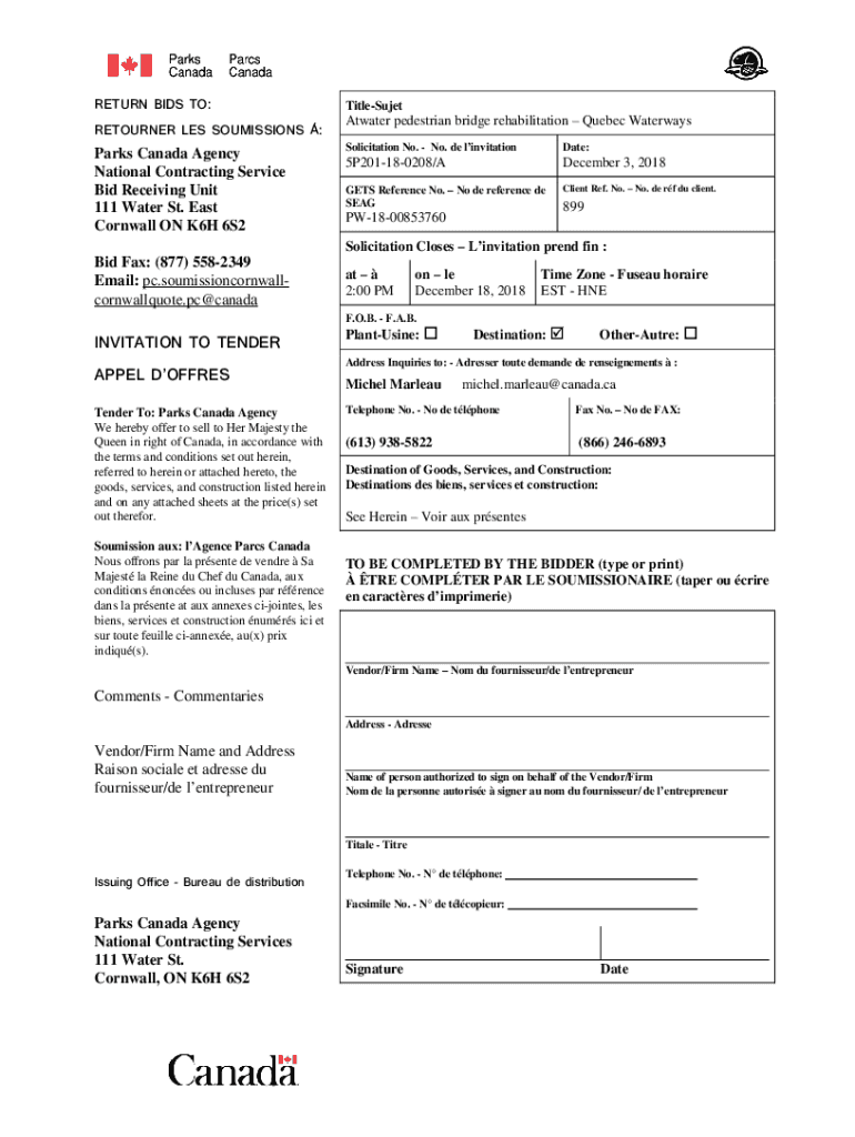 RETURN BIDS TO:TitleSujetRETOURNER LES COMMISSIONS :At water pedestrian bridge rehabilitation Quebec Waterways Parks Canada Agency National Contracting Service Bid Receiving Unit 111 Water St. East
