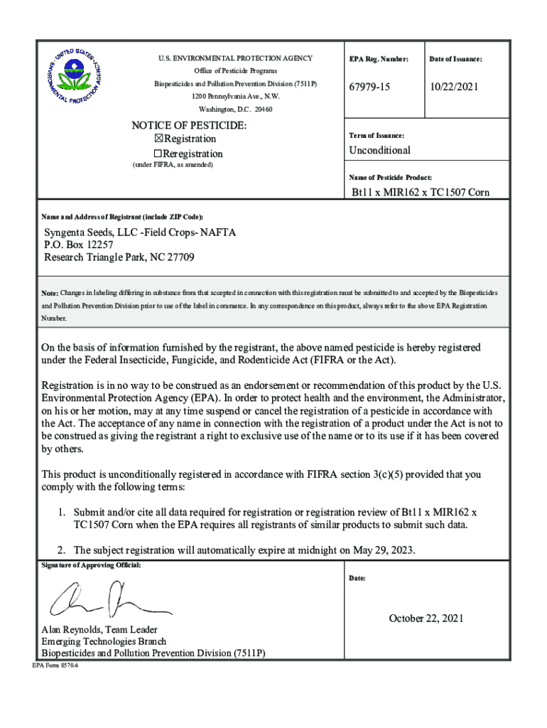 U.S. ENVIRONMENTAL PROTECTION AGENCY EPA Reg. Number:Date of Issuance:679791510/22/2021Office of Pesticide Programs Biopesticides and Pollution Prevention Division (7511P) 1200 Pennsylvania Ave.,