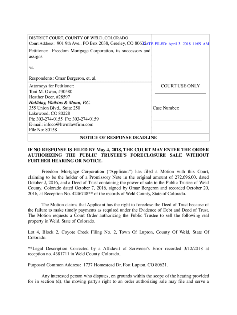 DISTRICT COURT, COUNTY OF WELD, COLORADO Court Address: 901 9th Ave., PO Box 2038, Greeley, CO 80632 DATE FILED: April 3, 2018 11:09 Petitioner: Freedom Mortgage Corporation, its successors and assigns
