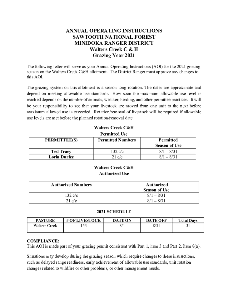 ANNUAL OPERATING INSTRUCTIONS SAWTOOTH NATIONAL FOREST MANITOBA RANGER DISTRICT Walters Creek C & H Grazing Year 2021 The following letter will serve as your Annual Operating Instructions (AOI) for
