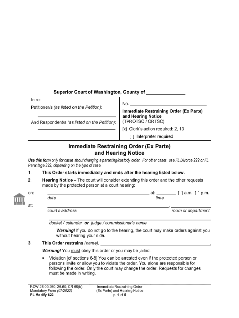 Superior Court of Washington, County of ___ In re: Petitioner/s (as listed on the Petition): And Respondent/s (as listed on the Petition):No. Immediate Restraining Order (Ex Parte) and Hearing Notice