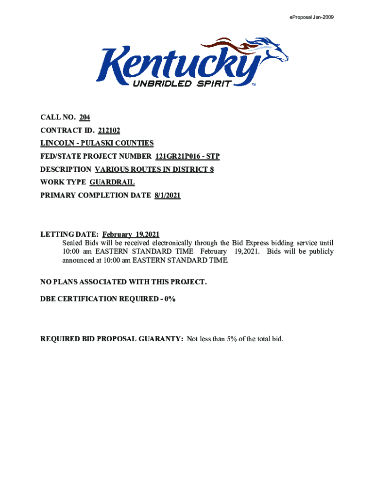 Proposal Jan2009CALL NO. 204 CONTRACT ID. 212102 LINCOLN PULASKI COUNTIES FED/STATE PROJECT NUMBER 121GR21P016 STP DESCRIPTION VARIOUS ROUTES IN DISTRICT 8 WORK TYPE GUARDRAIL PRIMARY COMPLETION DATE