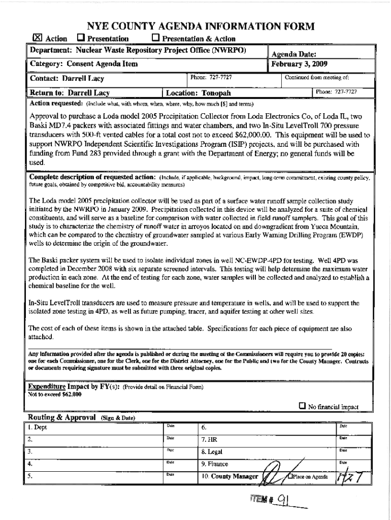 NYE COUNTY AGENDA INFORMATION FORM LI Presentation & Action Li PresentationAction Department: Nuclear Waste Repository Project Office (NW RPO) Category: Consent Agenda Item Phone: 7277727Contact: