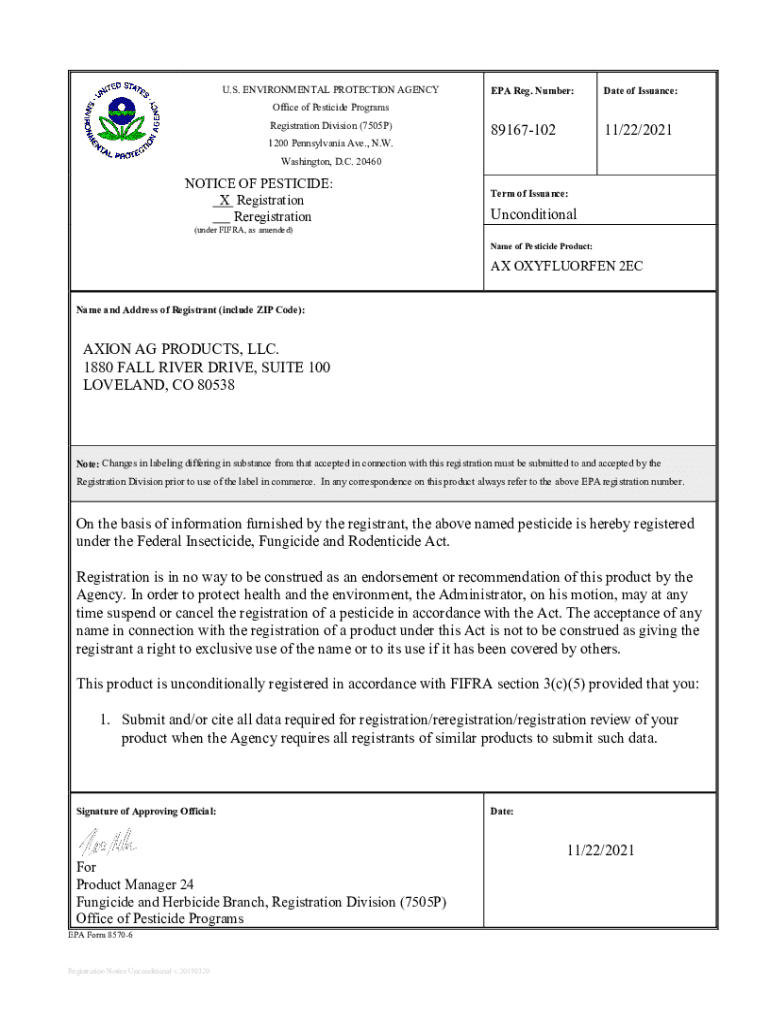 U.S. ENVIRONMENTAL PROTECTION AGENCY EPA Reg. Number:Date of Issuance:8916710211/22/2021Office of Pesticide Programs Registration Division (7505P) 1200 Pennsylvania Ave., N.W. Washington, D.C. 20460NOTICE
