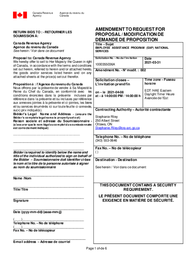 Canada Revenue AgencyAgence Du revenue Du CanadaAMENDMENT TO REQUEST FOR PROPOSAL / MODIFICATION DE DEMAND DE PROPOSITIONRETURN BIDS TO : RETURNER LES COMMISSION : Canada Revenue Agency Du revenue