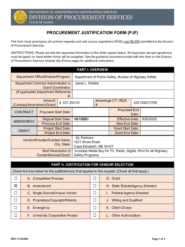 PROCUREMENT JUSTIFICATION FORM (PDF) This form must accompany all contract requests and sole source requisitions (RMS) over $5,000 submitted to the Division of Procurement Services. INSTRUCTIONS: