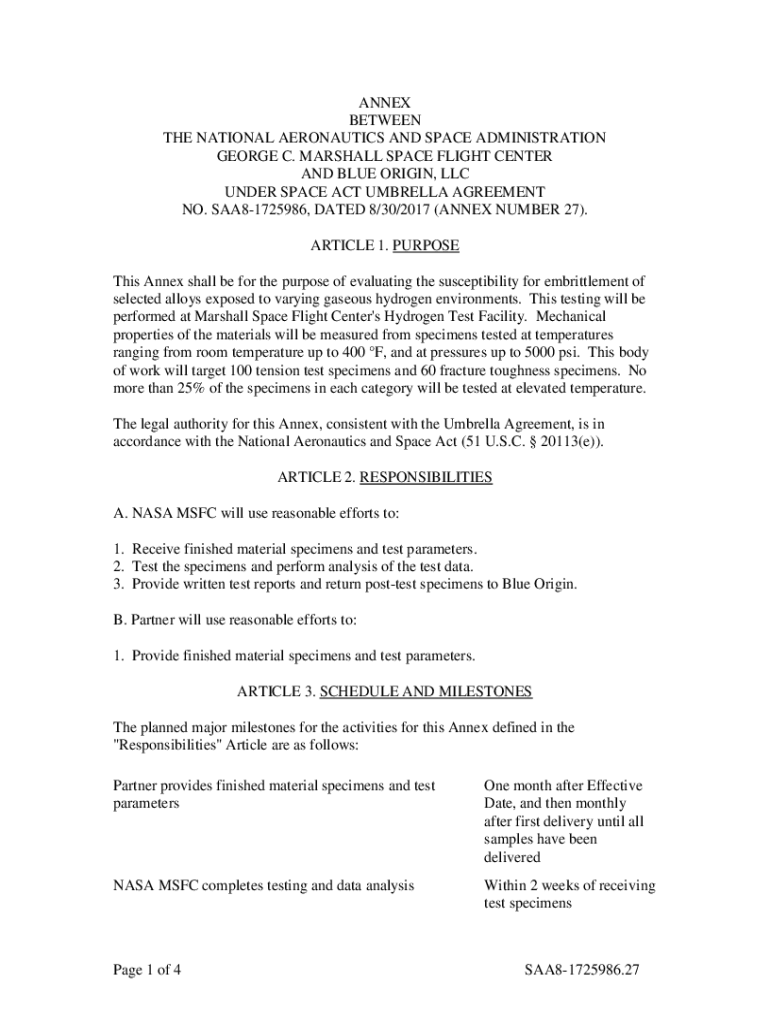 ANNEX BETWEEN THE NATIONAL AERONAUTICS AND SPACE ADMINISTRATION GEORGE C. MARSHALL SPACE FLIGHT CENTER AND BLUE ORIGIN, LLC UNDER SPACE ACT UMBRELLA AGREEMENT NO. SAA81725986, DATED 8/30/2017 (ANNEX