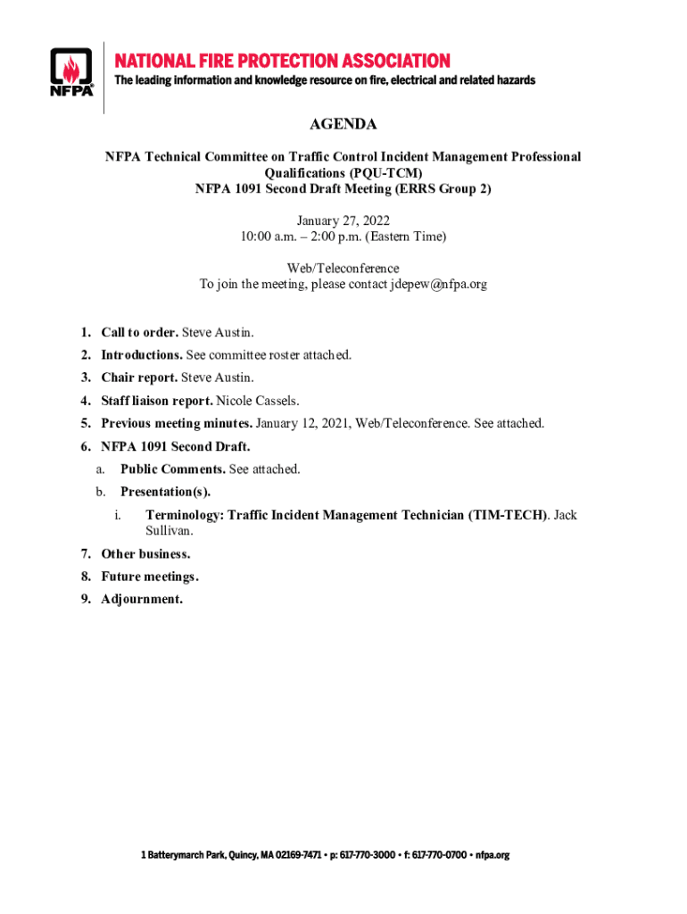 AGENDA NFPA Technical Committee on Traffic Control Incident Management Professional Qualifications (PUT) NFPA 1091-Second Draft Meeting (ERRS Group 2) January 27, 2022 10:00 a.m. 2:00 p.m. (Eastern