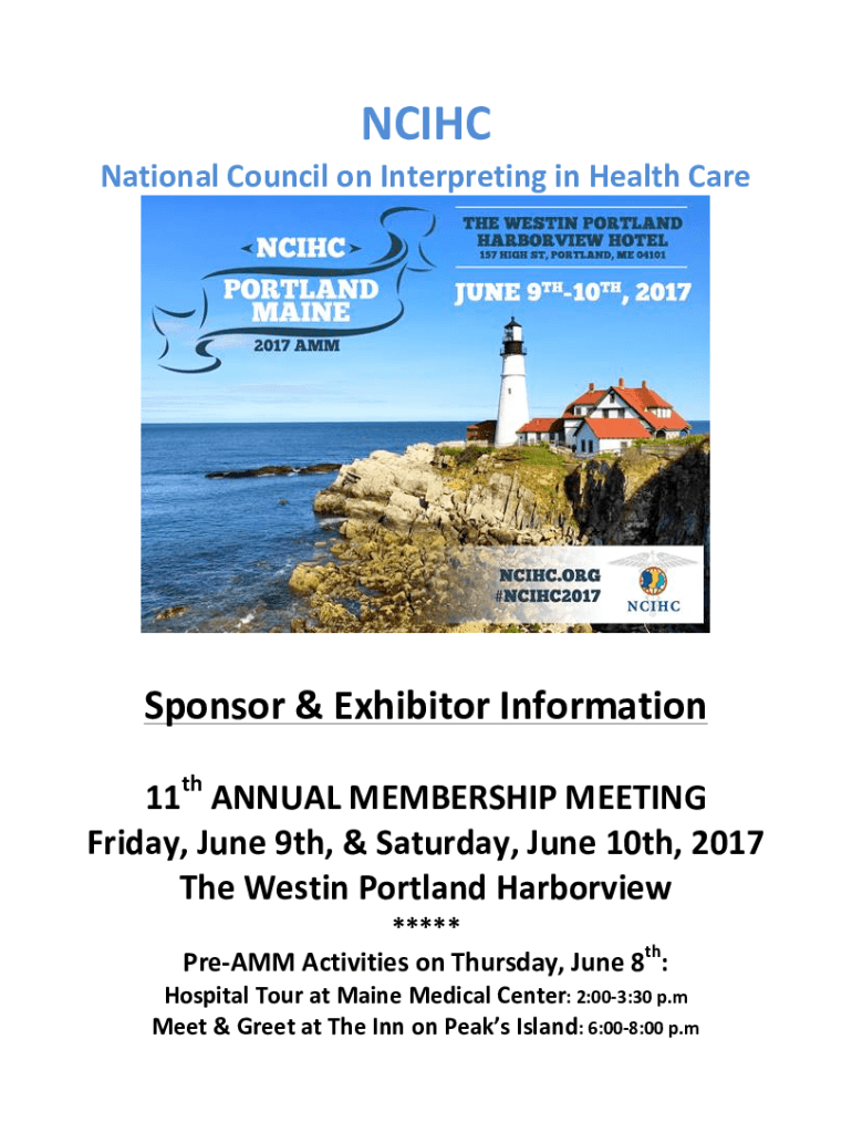 NCI HC NationalCouncilonInterpretinginHealthCareSponsor&ExhibitorInformation11thANNUALMEMBERSHIPMEETING Friday,June9th,Saturday,June10th,2017 TheWestinPortlandHarborview ***** PreAMMActivitiesonThursday,June8th:HospitalTouratMaineMedicalCenter:2:003:30p