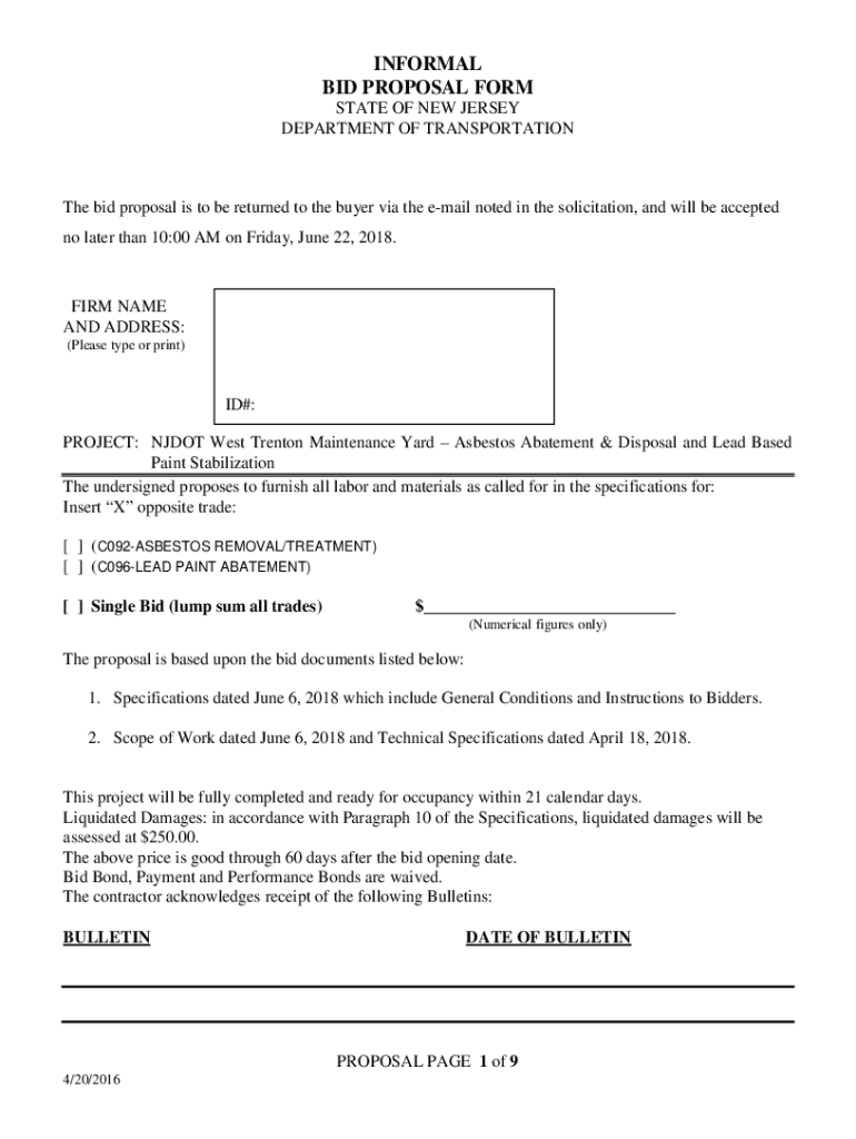 INFORMAL BID PROPOSAL FORM STATE OF NEW JERSEY DEPARTMENT OF Transportation bid proposal is to be returned to the buyer via the email noted in the solicitation, and will be accepted no later than