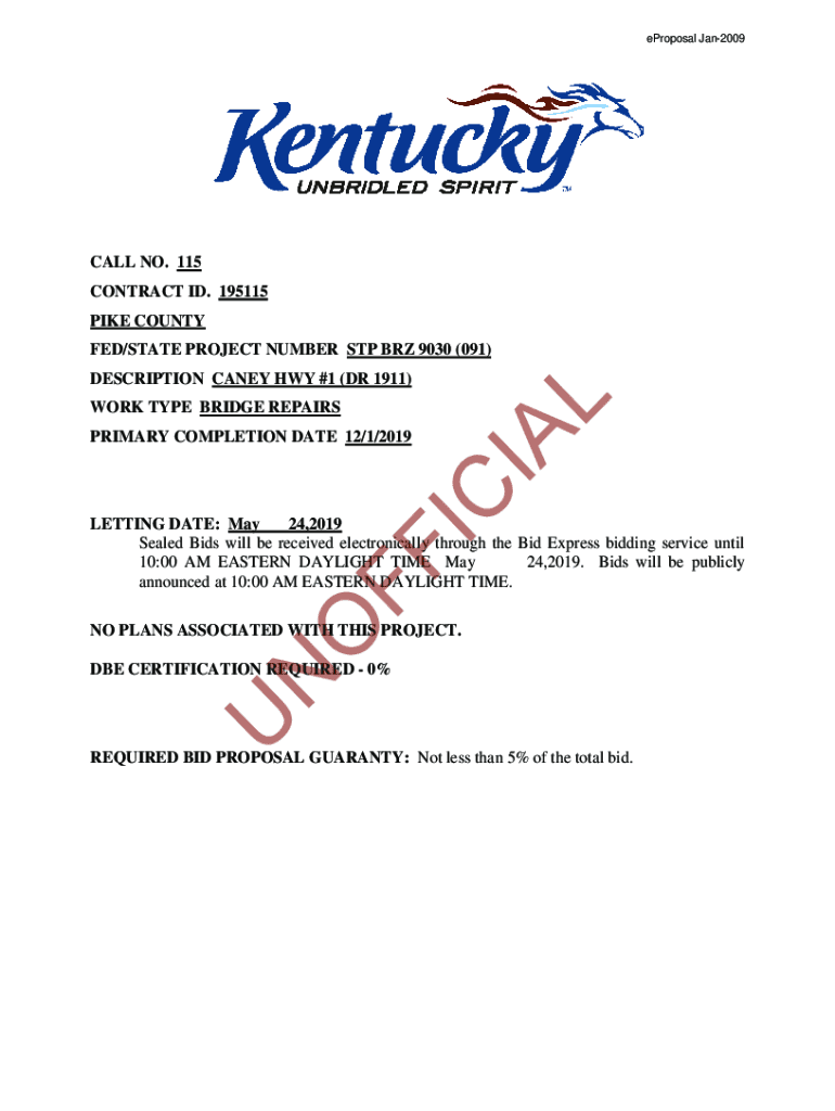 Proposal Jan2009CALL NO. 115 CONTRACT ID. 195115 PIKE COUNTY FED/STATE PROJECT NUMBER STP BRZ 9030 (091)DESCRIPTION CAREY HWY #1 (DR 1911)PRIMARY COMPLETION DATE 12/1/2019IAWORK TYPE BRIDGE REPAIRSOFFLETTING