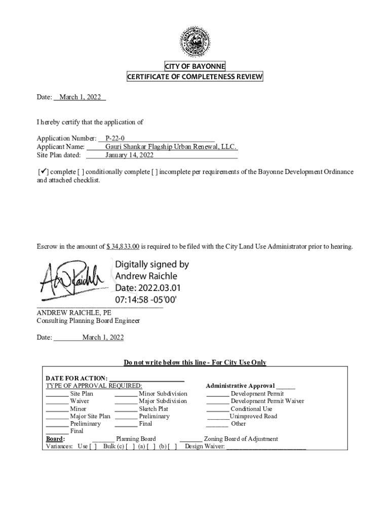 CITY OF BAYONNE CERTIFICATE OF COMPLETENESS REVIEW Date:March 1, 2022I hereby certify that the application of Application Number: Applicant Name: Site Plan dated:P220 Lauri Shankar Flagship Urban