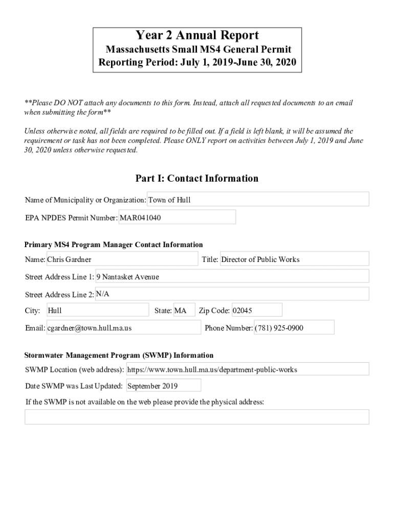 Year 2 Annual Report Massachusetts Small MS4 General Permit Reporting Period: July 1, 2019June 30, 2020**Please DO NOT attach any documents to this form. Instead, attach all requested documents to