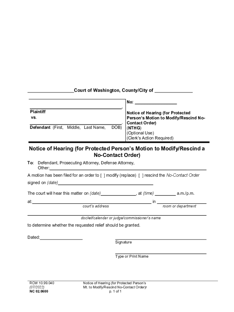 Court of Washington, County/City of, Plaintiff vs. Defendant (First, Middle, Last Name, No:Notice of Hearing (for Protected Persons Motion to Modify/Rescind No. Contact Order) DOB) (NTH) (Optional