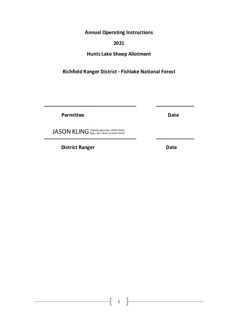 Annual Operating Instructions 2021 Hunts Lake Sheep Allotment Rich field Ranger District Fishcake National Forest___ PermitteeJASON KING___ DateDigitally signed by JASON KING Date: 2021.06.02 22:38:49