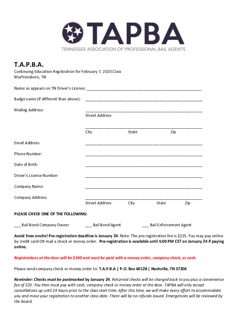 T.A.P.B.A. Continuing Education Registration for February 7, 2020, Class Murfreesboro, TN Name as appears on TN Driver's License: ___ Badge name (if different from above):___Mailing Address:___ Street