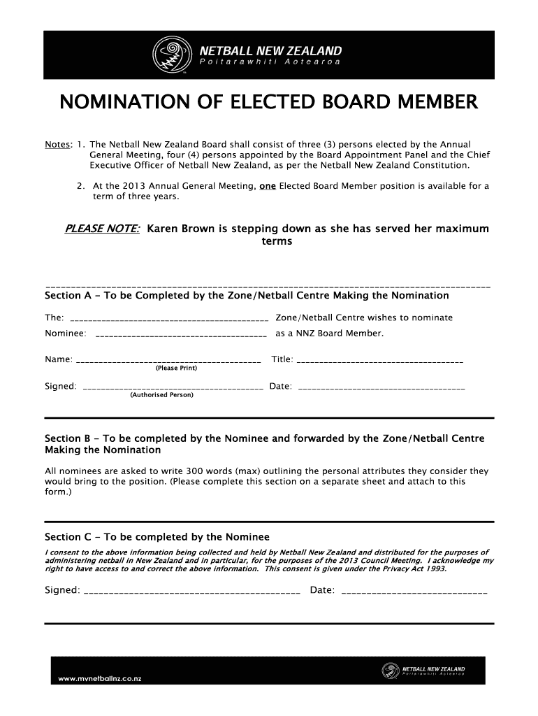 Get the free Nomination of Elected Board Member bFormb - Netball New Zealand