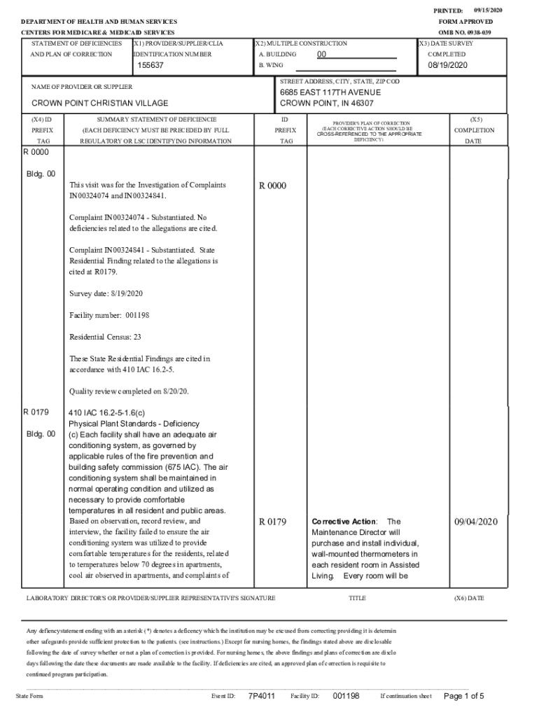 09/15/2020PRINTED: DEPARTMENT OF HEALTH AND HUMAN SERVICESFORM APPROVEDCENTERS FOR MEDICARE & MEDICAID SERVICES STATEMENT OF DEFICIENCIES(X1) PROVIDER/SUPPLIER/LIGAND PLAN OF CORRECTIONIDENTIFICATION