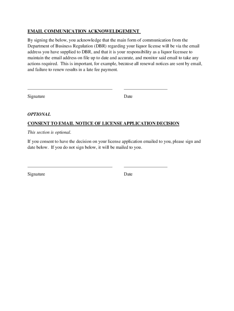 EMAIL COMMUNICATION ACKNOWLEDGEMENT By signing the below, you acknowledge that the main form of communication from the Department of Business Regulation (DBR) regarding your liquor license will be