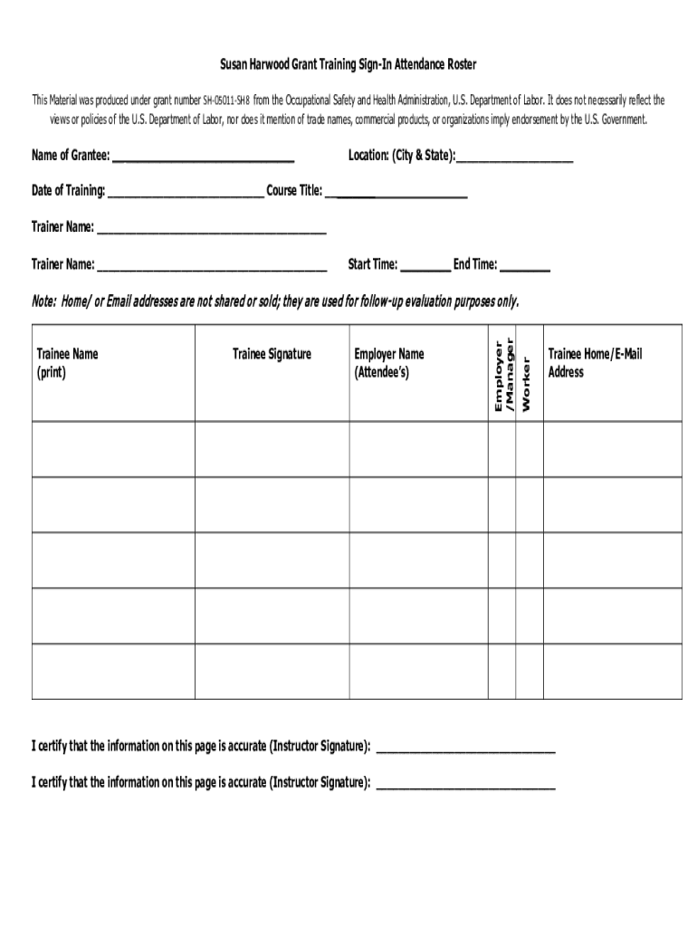 Susan Hardwood Grant Training Signing Attendance Roster This Material was produced under grant number SH05011SH8 from the Occupational Safety and Health Administration, U.S. Department of Labor. It
