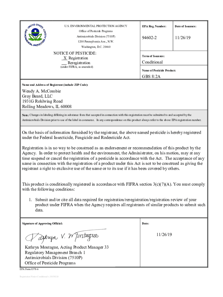 U.S. ENVIRONMENTAL PROTECTION AGENCY EPA Reg. Number:Date of Issuance:94602211/26/19Office of Pesticide Programs