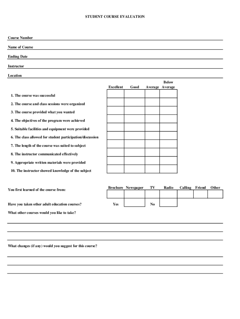 STUDENT COURSE EVALUATIONCourse Number Name of Course Ending Date Instructor Location ExcellentGoodBelow Average Average1. The course was successful 2. The course and class sessions were organized