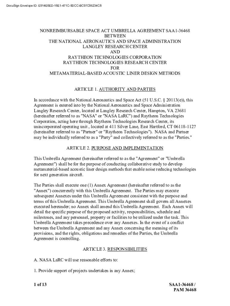 DocuSign Envelope ID: E914E6ED16E1471C9DCCBC97C95234C8NONREIMBURSABLE SPACE ACT UMBRELLA AGREEMENT SAA136468 BETWEEN THE NATIONAL AERONAUTICS AND SPACE ADMINISTRATION LANGLEY RESEARCH CENTER AND RAYTHEON