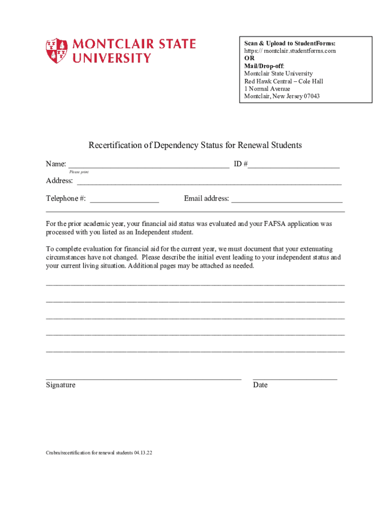 Scan & Upload to StudentForms: https:// Montclair.studentforms.com OR Mail/Drop-off: Montclair State University Red Hawk Central Cole Hall 1 Normal Avenue Montclair, New Jersey 07043Recertification
