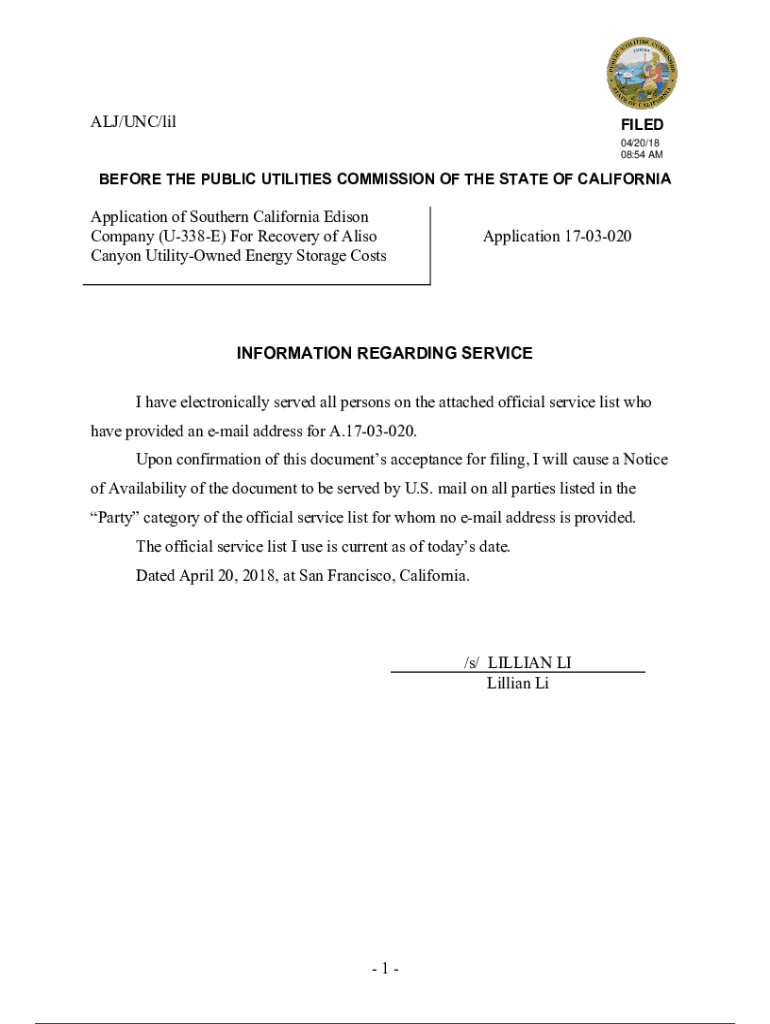 ALJ/UNC/misfiled 04/20/18 08:54 BEFORE THE PUBLIC UTILITIES COMMISSION OF THE STATE OF CALIFORNIAApplication of Southern California Edison Company (U338E) For Recovery of Also Canyon UtilityOwned