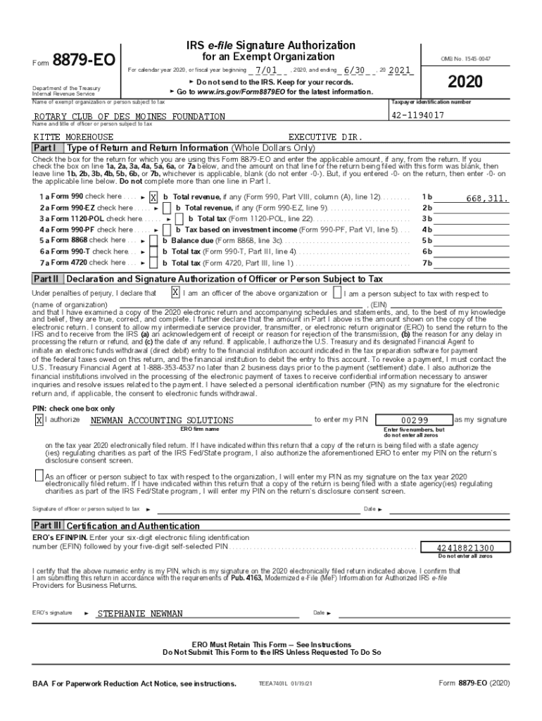 Form8879EOIRS file Signature Authorization for an Exempt Organization For calendar year 2020, or fiscal year beginning7/01, 2020, and ending OMB No. 154500476/30, 2020212020G Do not send to the IRS.