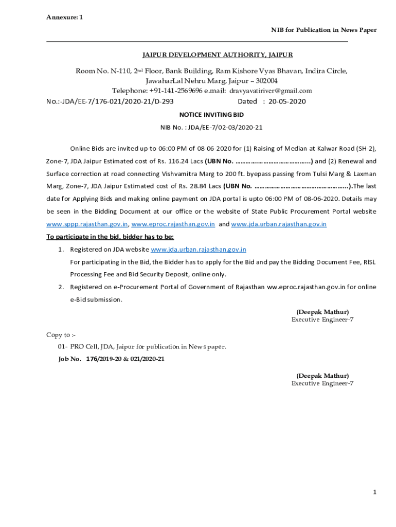 Appendix: 1 NIB for Publication in News PaperJAIPUR DEVELOPMENT AUTHORITY, JAIPURRoom No. N110, 2nd Floor, Bank Building, Ram Kishore Was Haven, Indira Circle, JawaharLal Nehru Mary, Jaipur 302004