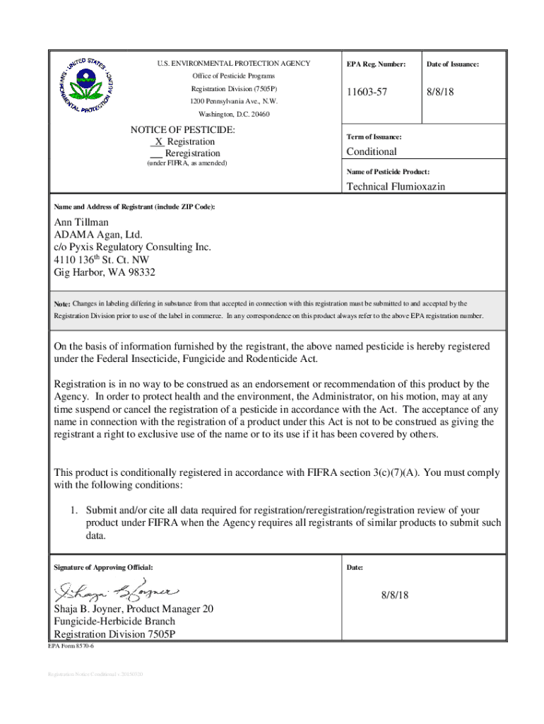U.S. ENVIRONMENTAL PROTECTION AGENCY EPA Reg. Number:Date of Issuance:11603578/8/18Office of Pesticide Programs Registration Division (7505P) 1200 Pennsylvania Ave., N.W. Washington, D.C. 20460NOTICE