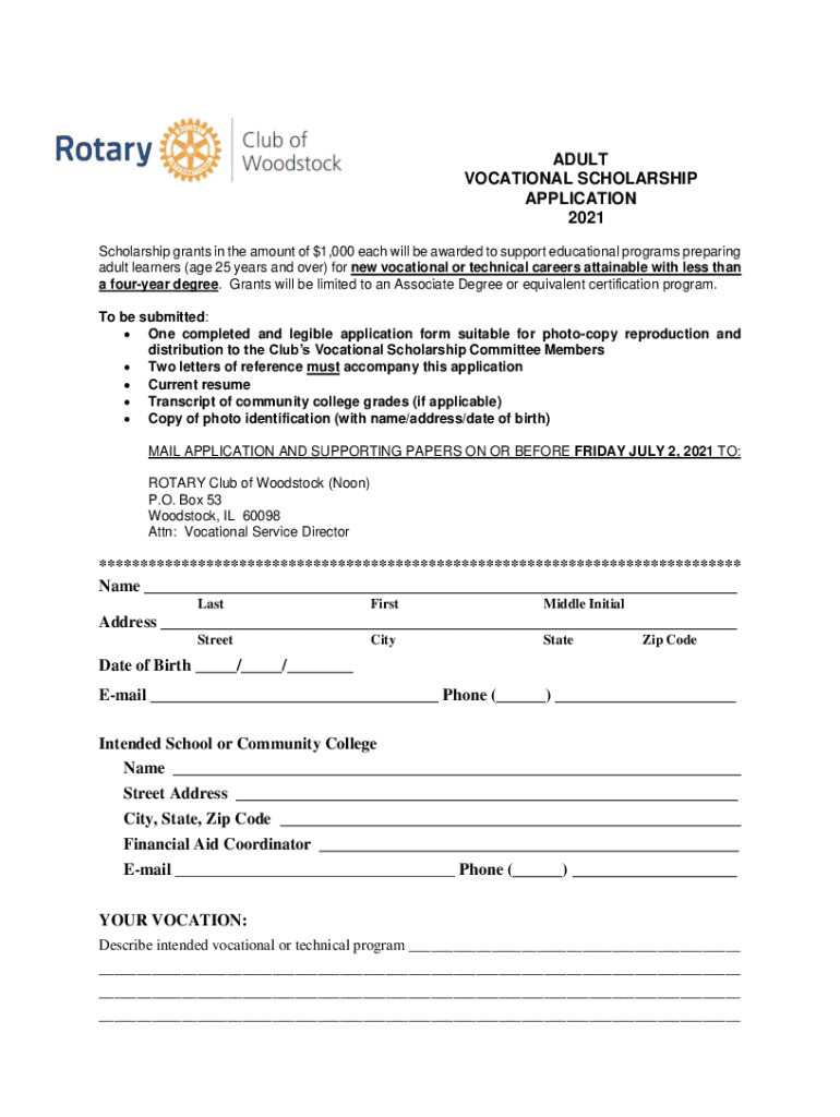 ADULT VOCATIONAL SCHOLARSHIP APPLICATION 2021 Scholarship grants in the amount of $1,000 each will be awarded to support educational programs preparing adult learners (age 25 years and over) for new