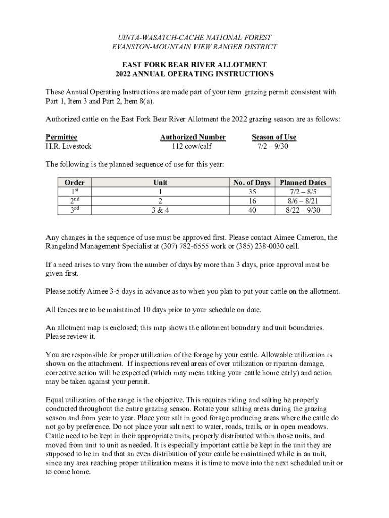 UINTAWASATCHCACHE NATIONAL FOREST EVANSTONMOUNTAIN VIEW RANGER DISTRICT EAST FORK BEAR RIVER ALLOTMENT 2022 ANNUAL OPERATING INSTRUCTIONS These Annual Operating Instructions are made part of your