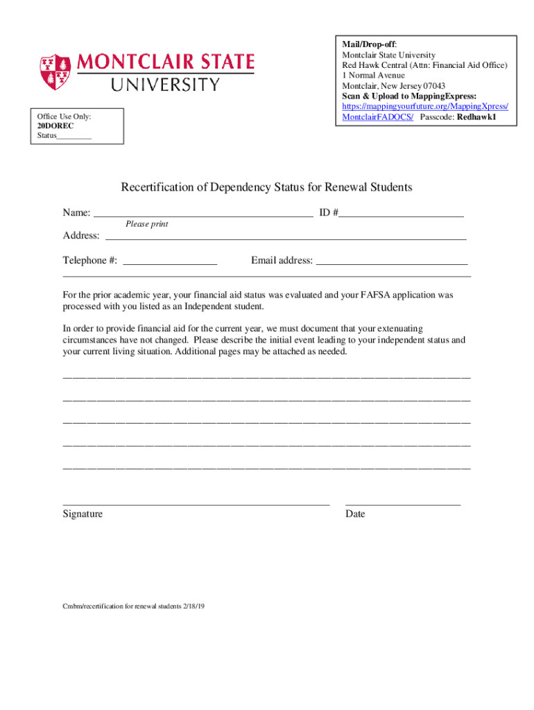 Mail/Drop-off: Montclair State University Red Hawk Central (Attn: Financial Aid Office) 1 Normal Avenue Montclair, New Jersey 07043 Scan & Upload to MappingExpress: https://mappingyourfuture.org/MappingXpress/
