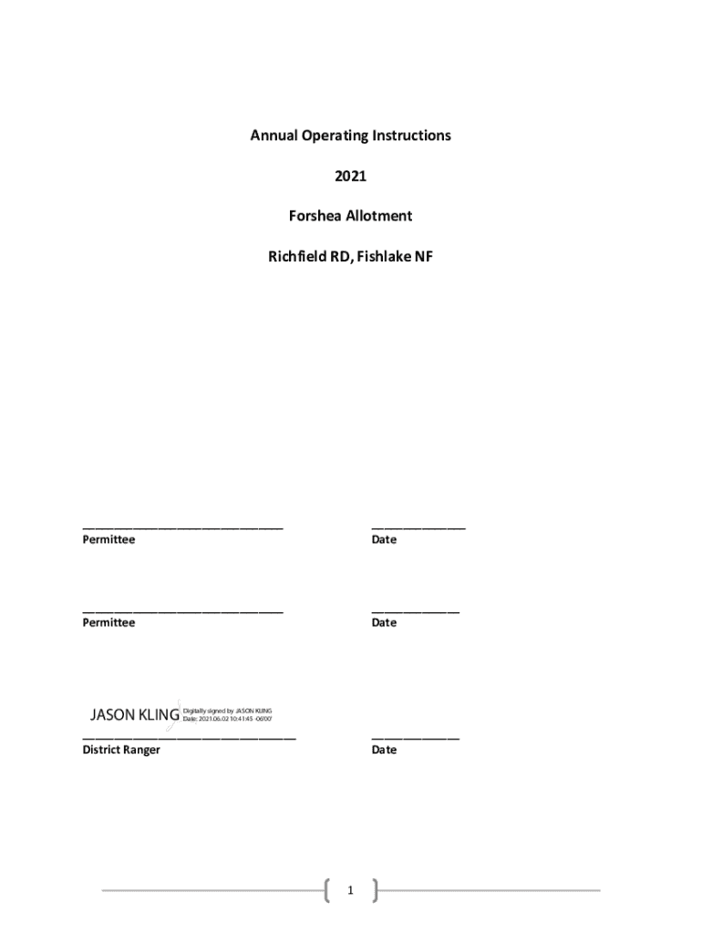 Annual Operating Instructions 2021 Forehead Allotment Rich field RD, Fishcake NF___ Permitted___ Date___ Permitted___ Date signed by JASON KING Digitally Date: 2021.06.02 10:41:45 06\'00\'___ District