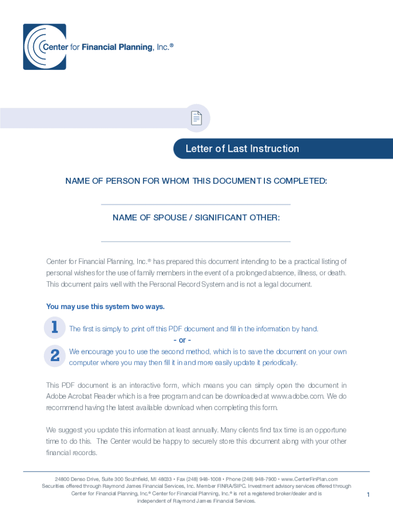Letter of Last Instruction NAME OF PERSON FOR WHOM THIS DOCUMENT IS COMPLETED:NAME OF SPOUSE / SIGNIFICANT OTHER:Center for Financial Planning, Inc. has prepared this document intending to be a practical