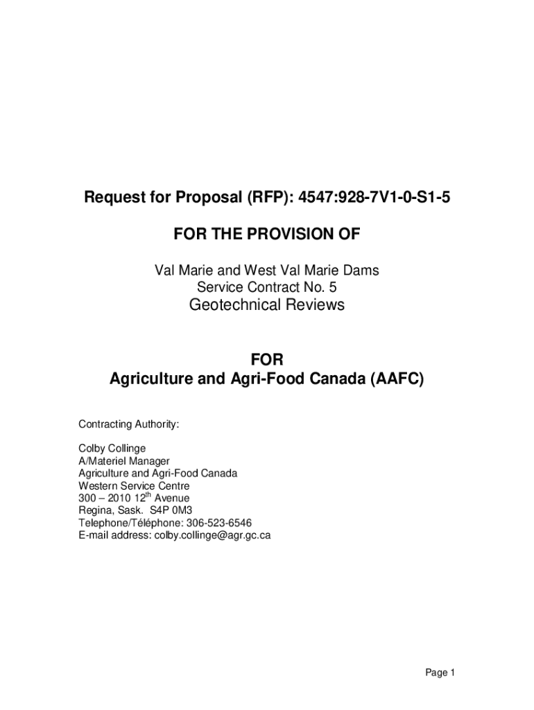 Request for Proposal (RFP): 4547:9287V10S15 FOR THE PROVISION OF Val Marie and West Val Marie Dams Service Contract No. 5Geotechnical Reviews Agriculture and Agri-food Canada (AFC) Contracting Authority: