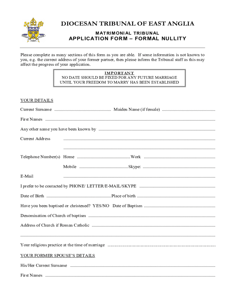 DIOCESAN TRIBUNAL OF EAST ANGLIA MATRIMONY AL TRIBUNALAPPLICATION FORM FORMAL NULLITY Please complete as many sections of this form as you are able. If some information is not known to you, e.g. the