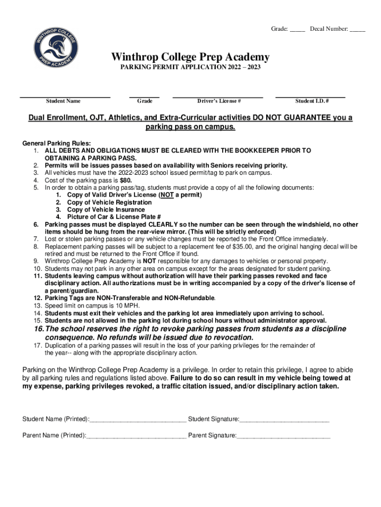 Grade: ___ Decal Number: ___Winthrop College Prep Academy PARKING PERMIT APPLICATION 2022 2023Student NameGradeDrivers License #Student I.D. #Dual Enrollment, OUT, Athletics, and ExtraCurricular activities