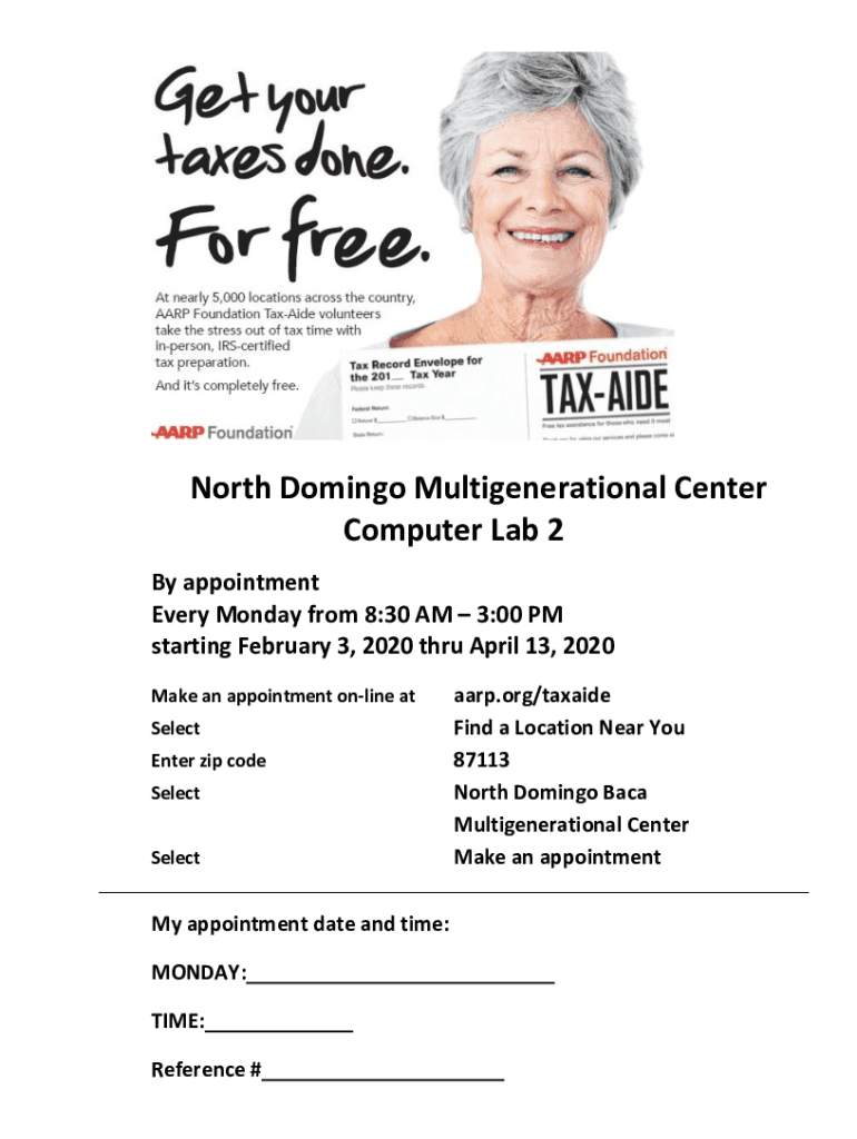 North Domingo Multigenerational Center Computer Lab 2 By appointment Every Monday from 8:30 AM 3:00 PM starting February 3, 2020, through April 13, 2020, Make an appointment online at Select Enter