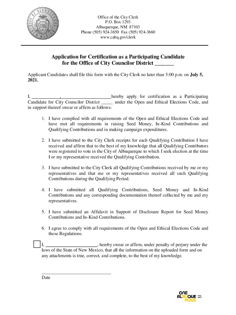 Office of the City Clerk P.O. Box 1293 Albuquerque, NM 87103 Phone (505) 9243650 Fax (505) 9243660 www.cabq.gov/clerkApplication for Certification as a Participating Candidate for the Office of City