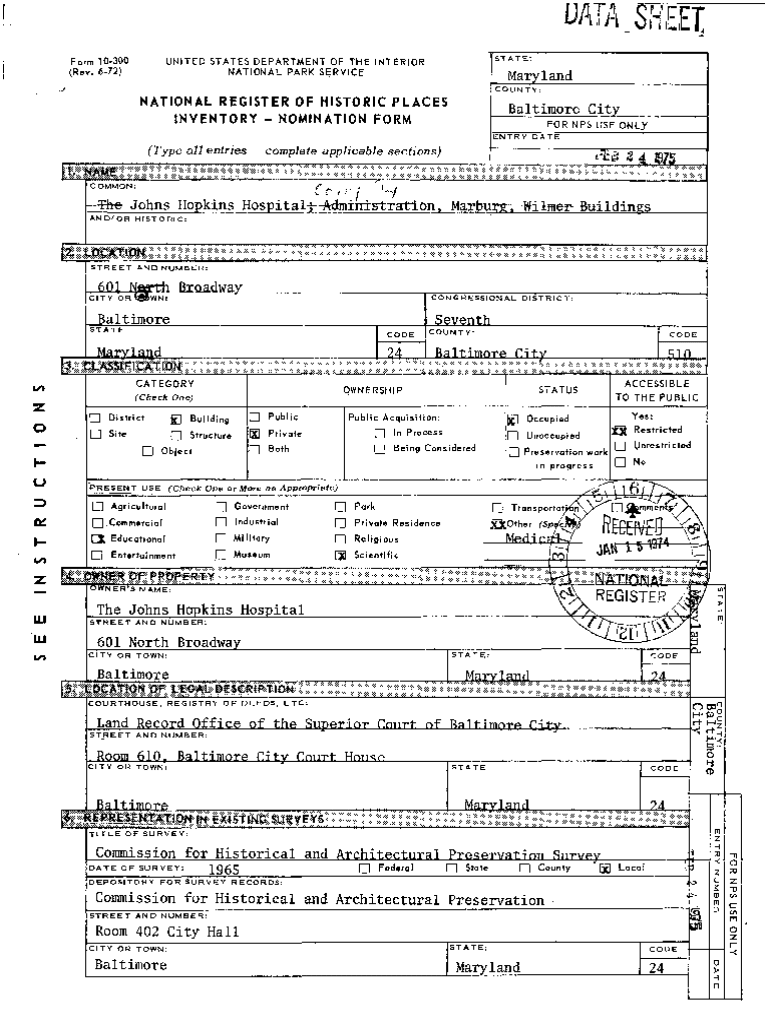 Form 10300 (Rev. 672)UNITED STATES DEPARTMENT OF THE INTERIOR NATIONAL PARK SERVICE Maryland COUNTY:NATIONAL REGISTER OF HISTORIC PLACES INVENTORY NOMINATION FORM Baltimore City FOR NPS USE ONL_Y
