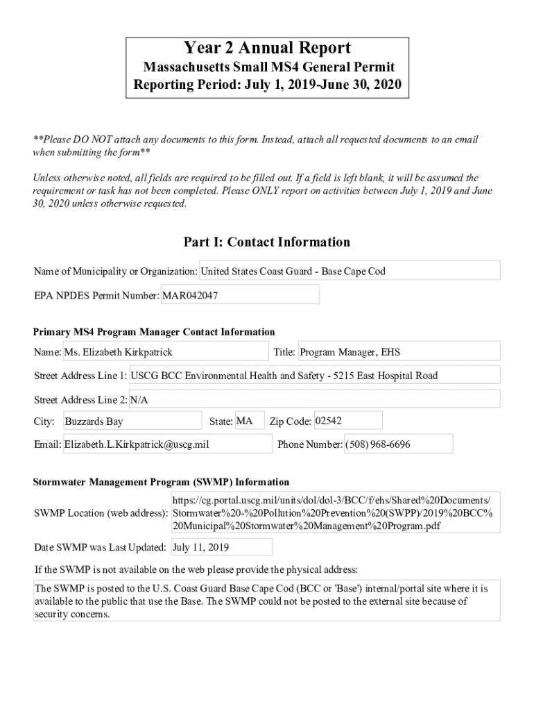 Year 2 Annual Report Massachusetts Small MS4 General Permit Reporting Period: July 1, 2019June 30, 2020**Please DO NOT attach any documents to this form. Instead, attach all requested documents to