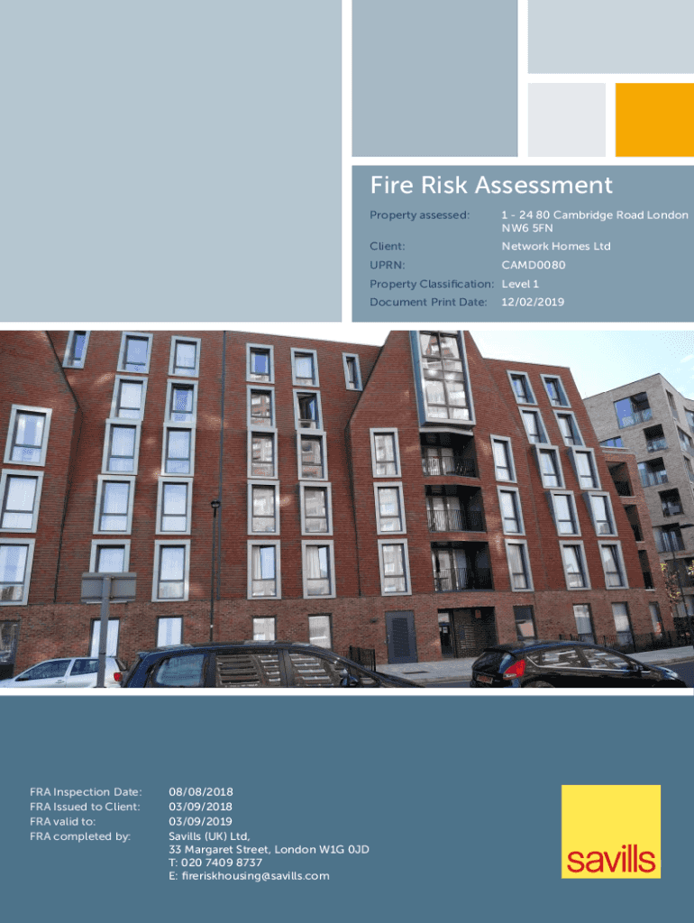 Fire Risk Assessment Property assessed:1 24 80 Cambridge Road London NW6 5FNClient:Network Homes Turn:CAMD0080Property Classification: Level 1 Document Print Date:FRA Inspection Date: FRA Issued to