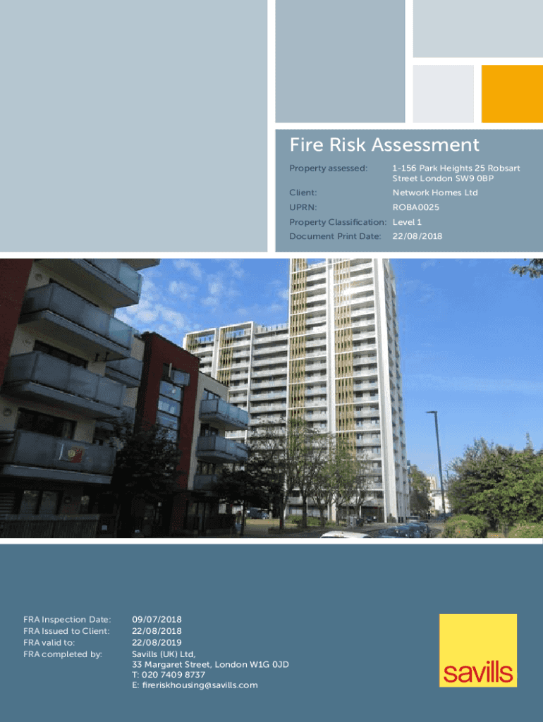 Fire Risk Assessment Property assessed:1156 Park Heights 25 Robs art Street London SW9 0BPClient:Network Homes Turn:ROBA0025Property Classification: Level 1 Document Print Date:FRA Inspection Date: